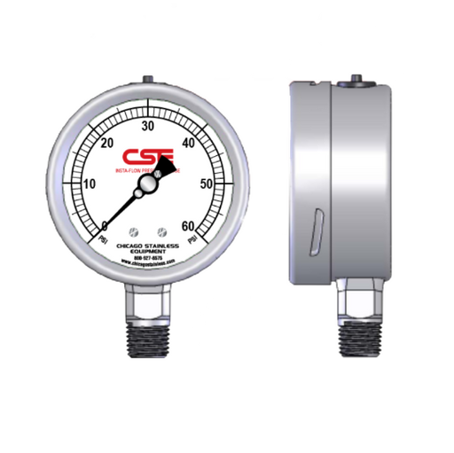 Chicago Stainless Insta-Flow SS Industrial Pressure Gauge, 0-60PSI, 1/4" NPT, Glycerin Filled, Bottom Mount